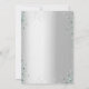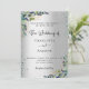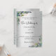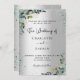 Faux silver looking background decorated with eucalyptus greenery, golden foliage and silver and green faux glitter, sparkles. Personalise and add your names and wedding details. Black letters.