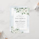 Modern chic watercolor white floral eucalyptus greenery and gold colour border frame on dusty blue background, with couple's monogram on the back, elegant and stylish, great invitation for rustic wedding, botanical wedding and beach wedding in spring and summer.
