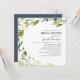 An elegant square bridal shower invitation, featuring a design of watercolor white flowers eucalyptus with other greenery illustration in shades of green in a wreath shape. The border frames the shower information in a combination of beautiful, elegant hand-written calligraphy and classic serif typography. The design is finished on the reverse with a contrasting smoky navy background Personalise with your information using the template fields provided. ***If you need a different colour on the reverse background or need help with customisation, please contact us using the button below.