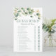 This beautiful modern watercolor eucalyptus with gold Guess Who? bridal shower game sheet is perfect for any shower. This fun and easy game is sure to bring lots of laughter to any bridal shower! It will definitely break the ice and get everyone talking and laughing. Simply give a sheet to each guest (don't forget the pens) and let the fun begin! You'll be amazed at how many people know of the answers. To make this bridal shower game your own simply select Personalise this template and type in the bride's name and the groom's name.