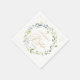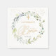 Baby Baptism/Christening Paper Napkins. This design features an illustration of greenery foliage and eucalyptus leaves in watercolor style. Above the leaves - confetti adorns the top of the Napkins (their images can be removed). On the top of the wreath there is an image of a Cross.
