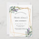 A stylish white background on the front. Decorated with eucalyptus and lavender florals. A faux gold geometric frame. Personalise and add a name and details.