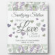 This sign is designed with a pandemic wedding in mind. It features a beautiful hand painted watercolor design of eucalyptus leaves and lavender in shades of sage green and light purple. The text reads: "Sanitizing Station. Spread Love not Germs" and is surrounded by festive hearts. There is space for the names of the couple and the wedding date. Great way to encourage your guests to help keep everyone safe and healthy.
