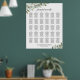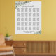 This beautiful 30 table wedding seating chart features a rustic yet elegant boho chic design with hand painted sprigs of watercolor eucalyptus leaves, foliage & greenery in shades of sage green. The script calligraphy title reads "please find your table" and there is space for the names of the couple and wedding date. The chart has table assignments for 300 guests at 30 tables (10 seats per table.)