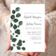 This elegant botanical wedding invitation features a border of dark green watercolor eucalyptus sprigs and leaves on a white background. The customizable right-aligned text combines charcoal gray handwriting script and small caps fonts. The solid grayish green back coordinates with the eucalyptus design.
