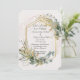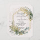 A beautiful wedding invitation set on a white background with Eucalyptus Leaves set in a gold geometric frame.