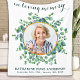 Honour your loved one with a custom unique memorial blanket in a modern eucalyptus botanical greenery design. This memorial photo blanket features elegant eucalyptus greenery, your photo, name and dates.