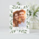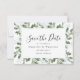 This beautiful wedding save the date card has a vertical photo against a frame of watercolor eucalyptus leaves. The words underneath the photo say Save the Date with space for the wedding date. On the back of the card you can add your names, the wedding date and location of your wedding.
