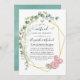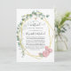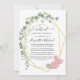 Trendy geometric eucalyptus greenery and blush pink roses online long distance virtual wedding ceremony invitation with gold geometric frame and mint watercolor wash reverse.