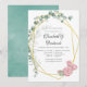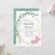 Trendy geometric eucalyptus greenery and blush pink roses rehearsal dinner invitation with gold geometric frame and mint watercolor wash reverse.