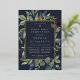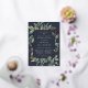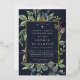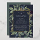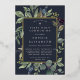 Chic botanical first holy communion invitation features a border of lush sage green botanical leaves and watercolor eucalyptus foliage with gold foil trim. Personalise with your ceremony and party details in modern lettering on a rich midnight blue background.