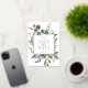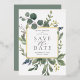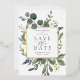 Our Eucalyptus & Sage wedding save the date frames your wedding details with an elegant square border of lush watercolor eucalyptus and sage green leaves, with real gold foil trim on a crisp white background.