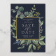 Our Eucalyptus & Sage wedding save the date frames your wedding details with an elegant square border of lush watercolor eucalyptus and sage green leaves, with real gold foil trim on a midnight blue background.