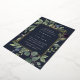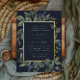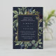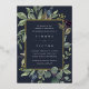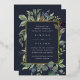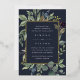 Elegant botanical wedding invitation frames your wedding celebration details with a border of watercolor eucalyptus leaves, blue flowers, and green foliage on a moody navy blue background. Luxe gold foil trim completes the design.