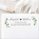 Elegant, Modern Watercolor Eucalyptus Hand Lettered Script Wedding Return Address Labels. Featuring a beautiful hand-written script bride and groom's first name template with swash-tail font in black, little heart shape between the names, green watercolor eucalyptus arrangement on white colour background. Easy to personalise them with your names and return address info.