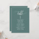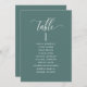 Help your guests find their table with this elegant modern seating plan cards with guests names. Double sided cards so guests can look from both, front or back for their names. Clear space all around giving you the liberty to use clips or punch hole for hanging displays, or use table holder/frame. Eucalyptus green background and white text. Modern hand written calligraphy details. Several colour options. Have all table numbers in same colour or mix colours according to your event's colour theme.