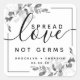 This modern design says spread love not germs in trendy script typography surrounded by eucalyptus leaves. Personalise with your names and wedding date.