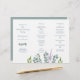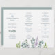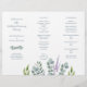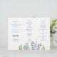 Eucalyptus folded wedding program template. Fold like an accordion to use for the ceremony. A little spray of blue-grey leaves decorates the front (left side panel) just beneath the names of the couple. More greenery and a sprig of lavender "grow" up from the bottom of white paper. Reverse is solid grey-blue colour.