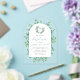 This elegant baptism invitation features a silver faux foil cross surrounded by a silver wreath adorned with watercolor eucalyptus leaves. The text is in elegant eucalyptus green handwriting calligraphy and charcoal gray italics and sans serif font on a white arch shape surrounded by eucalyptus sprigs. An ideal choice for a stylish, gender-neutral baptism invitation.