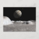 The surface of Jupiter's moon Europa is covered with strange grooves, as well as patches of jumbled terrain. Deep beneath this icy surface lies an even more mysterious underground ocean. In the distance we can see Io, one of Jupiter's other moons.
