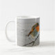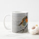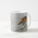 European English Robin birds on tree photo coffee mug. Red breasts birds on driftwood background.