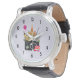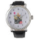 A watch with a graphic illustration featuring European landmarks such as leaning tower of Pisa, Big Ben, Eiffel Tower etc... A hot air balloon in the sky and a double decker bus, with a large camera. A stamp with the Egyptian pyramids stuck to the camera.