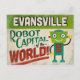A funny Evansville Indiana vintage travel postcard featuring a friendly robot with fun retro style text that says, "Evansville, Robot Capital of the world!"