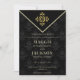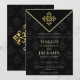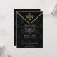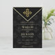 Elegant and stylish Evening Chic Wedding Invitation set on a patterned black background with a gold emblem.