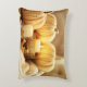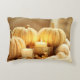 The evening glow accent pillow gives a feel of warmth and comfort with a design of hand-knit pumpkins and white glowing candles on a wicker tray. The colours are creams, tan, and white.
