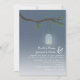 An outdoors evening wedding invitation featuring an illustration of a mason jar with candle inside hanging from a tree branch with green leaves. Personalise the text with your information.