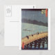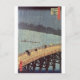 This Japanese colour print was created by Ichiyusai Hiroshige in the 19th Century. The full name of the print is: "Evening Shower at Atake and the Great Bridge". This Japanese print is from the famous series: One Hundred Famous Views of Edo" (Meisho Yedo Hiakkei). In it we see a few Japanese workers crossing a large bridge, while a storm is raging, and a lot of rain is falling. They're covering themselves with straw hats, coats and perhaps umbrellas. In the background we also see a Japanese sailor on a canoe like boat crossing the river. The sky is quite dark because of the storm, and it's too dark to see the forests behind. The artist has also signed this artwork in Kanji characters and Hiragana (Japanese writing).