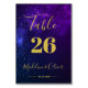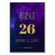 An evening sky with a purple hue and a modern elegant font is the design for this Wedding table card.