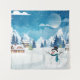 Evening village winter landscape with snow covered houses,snowman and mountains. Christmas holidays illustration