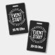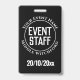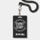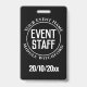 A badge for an Event Staff Member. Change the wording to your details. Festival Staff badge. Event Staff badge for a lanyard or clip. Official Event Staff badge. White text on a black background.