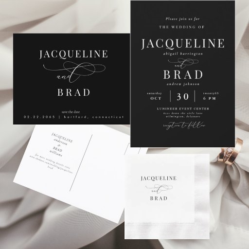 Black wedding invitation. Elegant Simplicity. Modern Design. Both Parents Listed. 2 Venues. Church.