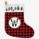 This stocking design has a red and black check pattern, with a boarder of evergreen trees, at the top. In the centre, there’s a monogram with a name, which can be customised.