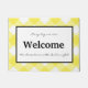 Plush door mat is shown in gingham yellow print and has a white background with black border and text. Text reads " Every day we rise," " Welcome" in bold print in centre and " we choose to serve the Lord our GOD". Outlined image of a dove behind the word 'Welcome'.