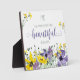 Plaque scripture verse from Ecclesiastes 3:11, "He has made everything beautiful in its time," surrounded by with lovely yellow and purple flowers. Designed by Simply Scripture; elements from The Hungry JPEG.