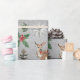 A watercolor painted Christmas wrapping paper featuring reindeer and all things Christmas on a shimmering silver background.