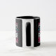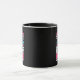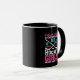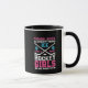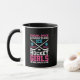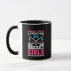 Hockey theme mug for the hockey girl with hockey pucks, sticks and helmets with pink, white, and blue text that reads Sugar, Spice and Everything Ice That's What Hockey Girls Are Made Of!