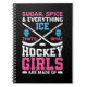 Hockey theme notebook for the hockey girl with hockey pucks, sticks and helmets with pink, white, and blue text that reads Sugar, Spice and Everything Ice That's What Hockey Girls Are Made Of!