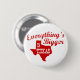 This pin back button contains a red graphic and text in the shape of the state of Texas.