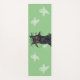 This yoga mat is green with a laughing evil black tree with red flame eyes surrounded by pale ghosts, a black cat, and a cute black spider dangling from a branch.
