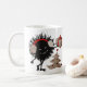 Customisable funny evil Christmas mug with a dark textured illustration with an evil black bug who holds a Christmas present with red ribbon. Even in its evilness, it’s as kind as to give presents. Next to the evil character there is a Christmas tree, with red Christmas balls and a red star. This evil character mug will make a great Christmas gift for someone who loves gothic style and funny cartoon characters.
