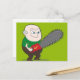 This is a cartoon illustration of an older bold man who's looking kinda angry at his chainsaw. Let's hope he's only planning on cutting down a tree and nothing more evil!