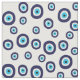 Crisp white fabric with a Mediterranean navy blue and aqua evil eye circular pattern