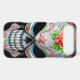 This intricate sugar skull design is decorated with large swirls and dot patterns. An old school rose tattoo sits in the middle of the skull’s forehead with leaves reaching out from behind. A red five point star appears between the eyes that are decorated with simple blue flower pedals. This gorgeous Day of the Dead sugar skull sits on a pure black background creating an aggressive and stylish iphone4 case.