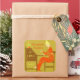 This personalised bookplate has a vintage stencil look. A woman in an orange dress sits at a writing desk with pen raised while a lamp shines next to her. The background is dark gold colour. The woman looks like she is from the 19th or early 20th century. The design has a modern Art Deco feel with squared lettering. The desk says, "Ex Libris," meaning "from the books / from the library of" in Latin.