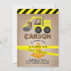 Yellow excavator scooping age number with dirt inspired text over an orange construction cone with caution tape. Yellow and black stripe border and reverse.