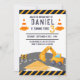 Excavator Construction themed birthday party invitations featuring a simple white background, with cute cartoon illustrations of excavator, sand, road, and cone . This is a modern kids birthday celebration template that is easy to customise and personalise.